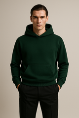Il fit boxy con spalle scese e linea leggermente ampia dona un look contemporaneo e rilassato, distinguendola dalle felpe tradizionali. La tonalità verde bottle green profondo è scura ed elegante, perfetta per chi cerca un’alternativa sofisticata al nero senza rinunciare alla versatilità.